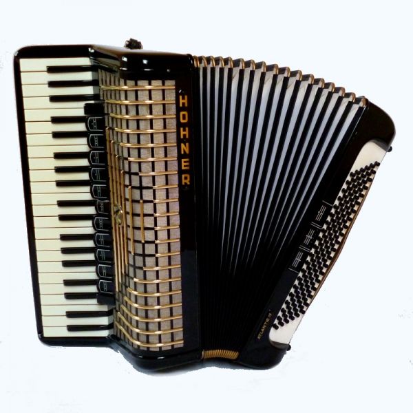 Bassgehäuse besteht aus Holz, Artiste Gold Stimmplatten. 2-fach und 3-fach Tremolo. Diskant Jalousie innenliegend. |