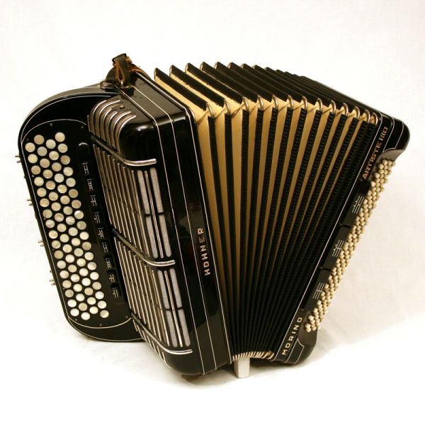 3 Diskant-Schieberegister am Griffbrett, Spitzenmodell von Hohner, Artistestimmplatten, Balg: Ziegenleder |